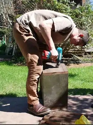 2) Labourer #1 then inserts the fibre blower into the open end of the layers and flicks a switch, which activates the heating of the press and the blower.