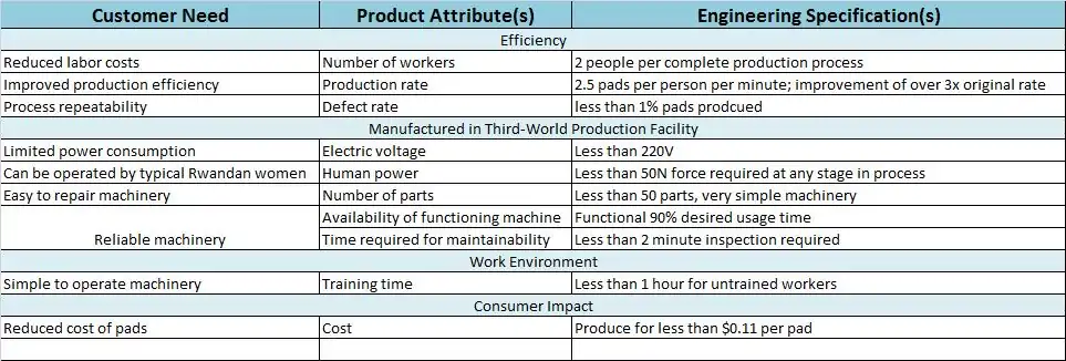 This process was designed to meet the needs of Rwandan women, which were determined by SHE: Sustainable Health Enterprises. The needs and the means used to meet these requirements are outline in the following table.