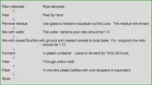 The first step is the preparation of the banana juice. The extraction of a high yield of banana juice without excessive browning or contamination by spoilage micro-organisms and proper filtration to produce a clear product is of great importance. Grass can be used to squeeze the banana so that only a clear juice is obtained. The residue will remain in the grass. One volume of water should be added to every three volumes of banana juice. This makes the total soluble solids low enough for the yeast to act. Cereals are ground and roasted and added to improve the colour and flavour of the final product. The mixture is placed in a container, which is covered in polythene to ferment for 18 to 24 hours. The raw materials are not sterilized by boiling and therefore provide an excellent substrate for microbial growth. It is essential that proper hygienic procedures are followed and that all equipment is thoroughly sterilized to prevent contaminating bacteria from competing with the yeast and producing acid instead of alcohol. This can be done by cleaning with boiling water or with chlorine solution. Care is necessary to wash the equipment free of residual chlorine, as this would interfere with the actions of the yeast. Strict personal hygiene is also essential. For many traditional fermented products, the microorganisms responsible for the fermentation are unknown to scientists. However, there has been research to identify the micro-organisms involved in banana beer production. The main micro-organism is Saccharomyces cerevisiae which is the same organism that is involved in the production of grape wine. However, many other micro-organisms were identified. These varied according to the region of production. After fermentation the product is filtered through cotton cloth.