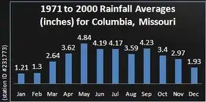 A 1900 square foot house with slanted shingle roof in Columbia, Missouri can collect a potential 2500 gallons in the month of March: