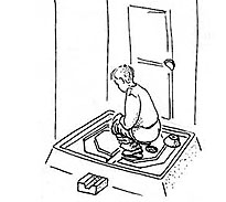 With the two slabs and the gutter ready for assembly it is easier to decide where the bathroom will be situated, in the house or near it. Now it has to be decided whether to compost the excreta or to collect them in a deep pit. Composting is STRONGLY recommended. A double composting cellar is known from sanitation projects in Vietnam and India. A drain has to be made for the water used in the bathroom, also containing the urine of its users. This spill water could also be collected as fertilizer. It contains essential agricultural nutrients. However, the odour from the collection of urine has to be prevented. One possible method is for the fluid to be piped to a subsoil root zone of a tree or shrub. If this is to be done it is necessary to dilute the urine approximately 4-1 with water so that plant roots are not chemically burned. This disposal method has the benefits of controlling odour, providing a nitrogen source for plants and supporting food plants, such as berry bushes, without exposing the food portion to contamination.