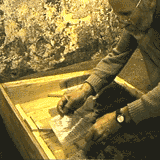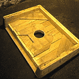 With the wooden mold of the slab make two imprints in moist dirt. The latest working method is to set the slab mold face up, fill with dirt, flatten and compact the dirt level with the top of the sides of the mold then quickly turn the slab over to a face down position. Moist dirt is then compacted around the sides of the mold to form the sides of the imprint. Finally, with great care, the wooden copy is lifted off the imprint. Often small repairs are needed, to the now almost complete imprint, which can be done with mud and something flat to fill and smooth imperfections.