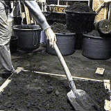 The imprint of the gutter is made in the same way as the slab imprints. Again the top of the wooden copy is filled with dirt that is compacted and flattened. Then the gutter mold is turned over, dirt is compacted against the sides of the mold which is then lifted off.