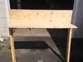 Armed with 8 4-foot long pieces of 1" by 12" pine, 6 3-foot long sections of 2x4, 70 1 3/4" wood screws, two sets of bits and drives, sandpaper, and two power drills, we set to work. We built half of the bottom and the back wall first, sinking screws through the pine board into the tops of two 2x4s in order to form the back legs of the dehydrator. Another pine board was attached to the bottom of the base in order to provide the attachment for the front half of the dehydrator floor, which was then attached using six wood screws. 2x4s were attached to the bottom of the front half of the dehydrator floor in the same method as before.