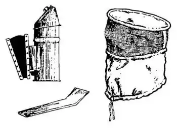 A beekeeper uses a smoker to produce cool smoke to calm the bees. The smoker consists of a fuel box containing smouldering fuel (for example dried cow dung, hessian, or cardboard) with a bellows attached. The beekeeper puffs a little smoke near the entrance of the hive before it is opened, and gently smokes the bees to move them from one part of the hive to another.