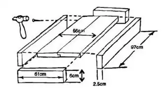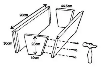 | Figure 2: A Kenya top-bar hive. This hive is suitable for African bees, but may need adjusting for Asian or European use. Any wood that is resistant to sun and rain and will not warp is suitable. (Drawing from Beekeeping for Beginners (1989) courtesy of GRATIS) |