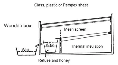 Another option for processing the wax is a solar wax melter (Figure 4). This appliance is easy to make and consists of a wooden box with a galvanised metal shelf with a spout, a bowl or container that sits under the spout, and a glass or plastic cover. When placed in the sun the temperature inside the box will melt down a comb and the wax will flow into a container inside the box. Any honey that was left in the combs will sink to the bottom; it is usually used for cooking or beer making as its taste is spoiled somewhat by this process.