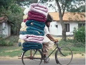 Cyclist carrying mattresses, Puttalam District. An example of ordinary bicycle used to transport difficult loads. Photo: Practical Action.