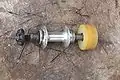 The drive train for the Bike Rodeo Bicycle Blender. It's main components are a bicycle hub, a skateboard wheel, and a blender coupling.
