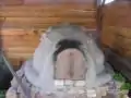 Once finished with the oven it must be given sufficient dry time. Starting small fires inside the oven to provide warmth and to facilitate evaporation of moisture can quicken drying the oven. It is a good idea to use several of these small fires over a couple of days in the oven to help dry it out, especially if you live in a moist climate. We built three small fires in our oven to help get the moisture out before firing it to cook with. Our oven did experience some cracking in the dense layer however. The fix for cracks is to patch it up with material that is the same mix as whichever layer cracked. So, for our oven we used a 2:1 sand/clay ratio mix to patch it up, and it has lasted well through at least two hot firings. After these small drying fires it is time to begin cooking. With the oven itself completed, a door will need to be constructed to help keep the heat in while baking. The door is basically just a wooden plug that is fit to slide into the doorway of the oven. It can be covered with foil to keep it from burning, but some people find that when cooking it helps to drape a wet cloth over the door to let more moisture into the baking chamber.