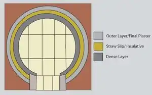 The second layer of the oven aids the dense layer by keeping the heat from the fire within the oven instead of letting it radiate outwards. This second layer is known as the insulative layer. It is composed of straw, with some clay slip added.