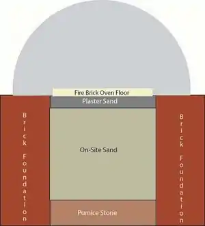 The first layer, which is the inner wall of the cooking area, is known as the dense layer, this is perhaps the most important layer to the oven. This layer is the "thermal mass", meaning it absorbs the heat of the fire and slowly radiates it. This radiated heat is what cooks the food in the oven. The dense layer is made up mostly of sand with some clay added.