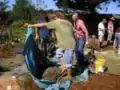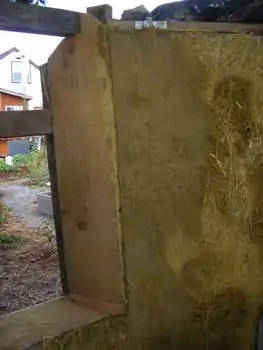 After the best mixture of plaster was chosen our next step was to begin the application of a clay slip, also known as an aliz, to the straw bale wall. The clay slip acts as an adhesive to the straw bale wall and the plaster. In order for the clay slip to function as it is meant to, a few things need to take place. First, the bales need to be sprayed down with water until the wall looks as though it is "sweating". Its best to apply the slip by working it into the wall. By this I mean, the clay slip needs to be kneaded into the wall, similar to a cat kneading a blanket. The straw bale wall is not smooth, the clay slip equally should not look smooth, rather it should look bumpy. Next the clay slip needs to dry, for at least three days to a week. Remember to water the wall again in order to ensure that the clay does not dry too quickly. After the clay slip is applied and allowed to dry, plaster can be mixed and applied to the wall.
