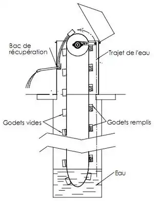 - The cup pump (see vintage advertisement in Appendix 8: Pump "Masure"): the pumping of the water is done through circulars cups centered on a cable. These specially shaped cups take up water by direct uptake and by capillary action.