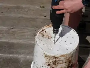 Figure 2: Drilling holes. (Photo by Devin Paine) - Stack the two top buckets inside the bottom bucket.