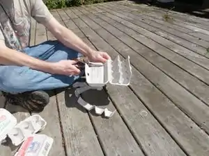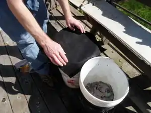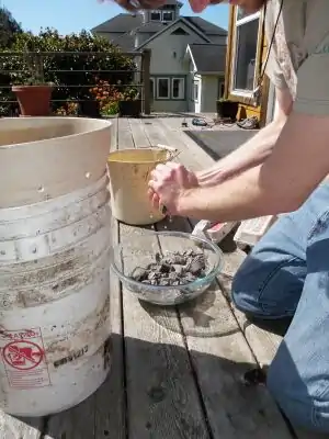 Figure 7: Adding the worms. (Photo by Katie Harris) - Place the lid loosely on the top bucket. In this example, we used landscaping cloth affixed with a rubber band, but this made access difficult. If you use an improvised lid such as this, we'd recommend using 8 clothespins or paper-clamps, but the lid that came with the bucket is the preferred solution. Also, be mindful you do not cover up the ventilation holes under the lip of your top bucket.