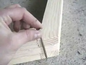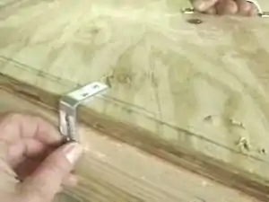 - Fig 21: Add L-brackets with 1" dichromate screws, one L-bracket for each side of plywood pentagon top. For added security of plywood bin top staying in place(i.e. if you have lots of racoons in your area)you can add nails into L-bracket holes by drilling small holes into bin sides allowing a nail to fit in the hole and secure the top in place.