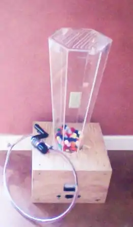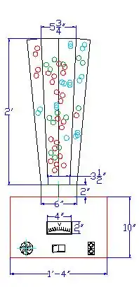 The Bubble Box is an original product created and constructed by Team Jumanji for the CCAT Kid’s Zone. The Bubble Box converts kinetic energy into electricity using a hand crank. A fan is powered by this electricity which generates wind flowing through a cone filled with light weight cloth balls. Once the fan reaches near full power, the cloth balls float towards the top of the chamber. As seen in Figure 2 the entire structure consists of three key components; the hand crank, base, and conical wind tunnel. An AutoCAD drawing in Figure 3 gives the Bubble Box’s dimensions.