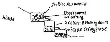 Three-tiered Hillside system- Similar to the design I chose, this system builds the bins in to a hillside. This makes turning easy- gravity assisted compost turning!! The only hillside able to hold this system was located up hill from most of the garden. Plus having a potential rodent food source right next to the kitchen is not a good idea. |