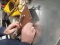 Karina checking out the groove in the wheel to see how it would fit with a belt.