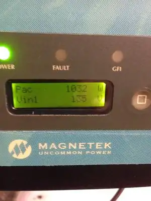 CCAT's rooftop solar panels - The image on the left shows the inverter display screen found CCAT's downstairs room. Check the inverter to see if the voltage and power are what is expected. Press the button next to the display to light the display and scroll through the different parameters. Check to see if Voltage 1 (V1) is around 135V. Check to make sure the power is around 1000W. If either one varies significantly (more than 20 for V or more than 100 for P) refer to the troubleshooting section to decide what to do next.