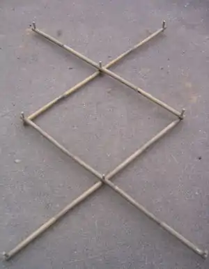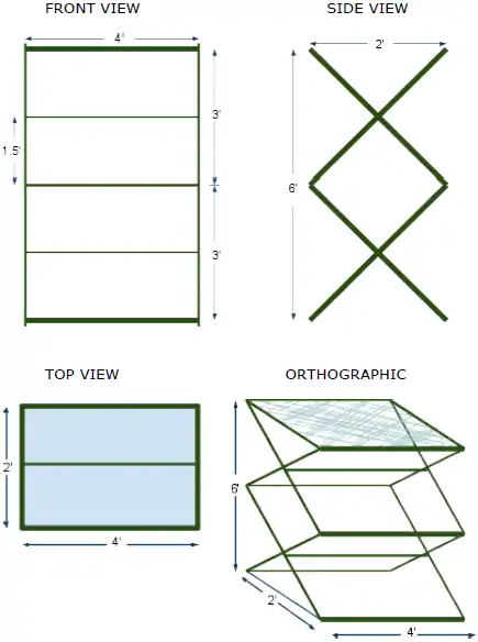 The general design is 2 main rectangles 3.6'x 4' divided into two squares by a horizontal piece. Each rectangle is then joined by a diagonal piece on ether side. Each bottom pole is tied to the leg of it's opossing side peice to prevent over expanding.