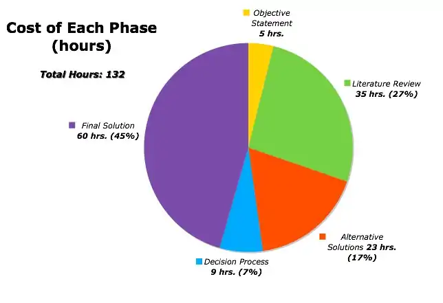 The costs of the project include design time, labor time and material costs. These costs are composed of first: a pie chart depicting the number of hours spent on each phase of the design process. Second: a table illustrating material costs. Third: a table depicting the potential costs of maintenance and repair.