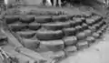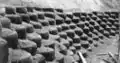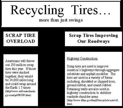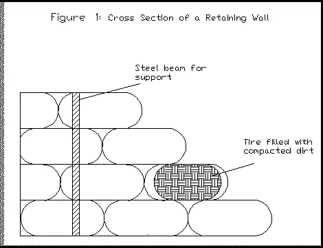 Whole tires are used to construct walls to reinforce unstable ground. Each tire is filled with compacted dirt, as shown in Figure 1. Tires are tacked vertically, adjacent tires are fastened together and metal posts are driven through the tire centers and anchored into the ground.
