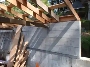Construction started on the shed with the preparations with the foundation. Three (3) 2’x2’x2’holes had to be dug out of the existing slab for the foundation of the three supporting 2x6 columns. These blocks of concrete are for the potential uplift created by the overhang of the roof. Three stem wall forms were built to provide a platform for the future alternatively built walls to be placed out of moisture. A stem wall was also built on top of the existing retaining wall to give the back side of the roof the desired height. Because the existing retaining wall dog legs down on the south side, bigger forms were built to raise the back wall up level all the way across for the span of 24.’