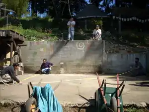After the forms were all built, all of them were reinforces with #4 rebar. The stem walls laid on the existing slab were keyed in with rebar to prevent them from lateral movement. The concrete was donated from Eureka Ready Mix Concrete Co. Inc., and the pump truck was also donated from Powel Pumps. On poor day the whole retaining wall, which was made of cinder block, was filled all the way across up to the top of the forms. The stem wall and 2’x2’ blocks were also filled on the slab. Before drying, 5/8 inch anchor bolts were placed 4’ o/c for the sill plate on the back wall. For the three supporting 4x6 posts, Simpson Strong Tie CB46 were placed so the beams could be directly attached to the foundation. The whole project required 9 yards of concrete to complete.