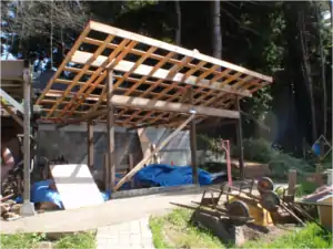 As of this writing in May 2010, the shed is a standing skeleton of timber and roof. The three walls are about half way built, and will hopefully be done before summer. Some projects that still need to be done are as follows: