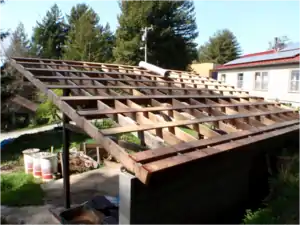 The roof of the shed has a three foot eve on every side except the back wall. Three feet was needed in order to protect the fragile walls from the harsh elements of Arcata’s rainy weather. But the eves also caused problems with potential uplift. So the three columns were all designed from the foundation up to counter act the uplift. They are all sitting on a 2 foot cube of concrete with heavy Simpson ties for the column base. The columns extend all the way to the roof where they are connected with lag and machine bolts to the roof header. This balloon style of construction makes the shed stout to all the elements. The 24’x18’ roof is also a source for a rainwater catching system that will provide water a future outdoor rinsing sink.