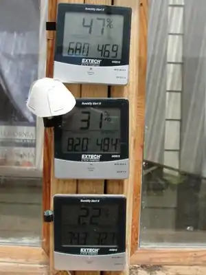 The greenhouse has two main components: the Sturdi-Built prefabricated greenhouse structure and the beach grass clay slip wall. The greenhouse structure has a variety of small issues that can be checked on a regular basis to ensure the proper operation of the greenhouse. The beach grass clay slip wall is an experimental wall that requires monitoring for its continued success. As a wall built of earthen components, the moisture content of the wall is important. Straw is generally thought to degrade at 20% moisture content and 14% moisture content is considered safe.[2] It is therefore important to check the humidity level inside the wall on a regular basis to predict whether the wall is suffering internal degradation. The wall humidity sensor is indicated on the bottom monitor.