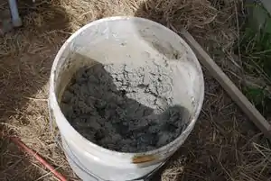 - Combine the plaster ingredients. Previously used 1 part slaked lime, 3 parts river sand, and horse manure “to taste”, which was about 4 handfuls in a 5 gallon bucket. Combine these slowly while blending with a paint mixer. The final plaster should hold its shape and have noticeable fibers when broken apart.