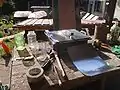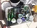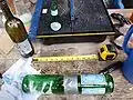 All the necessary components for prepping the glass bottles - A tile saw, flashing, tape measure, duct tape, a sharpie, etc