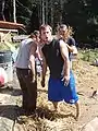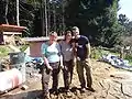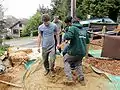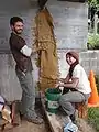Adam and Mitra prepare the burlap sack and clay idea to help the cob wall stick the the concrete wall