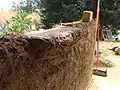 At the end of each day of laying cob, sources recommended that we leave a spine and rib layer on top. This is so the next time we start building, we are able to incorporate our new layer with two layers form the last building day. This technique also allows for more of the cob to dry, especially with the help of the holes from the "cobber's thumb". We made sure at the end of each work day to put many holes in the cob to allow for drying and easier blending the next time we built.
