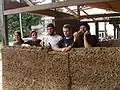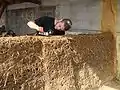After we thoroughly mixed together the sand and clay, we then add straw. We sprinkle long pieces of straw, evenly covering the mixed sand and clay, and stomp it in. We burrito a few more times, adding more straw each time. When the consistency of the cob is thick and hard to pull apart with your fingers, we knew it was ready to be bundled into loaves and placed on the wall.