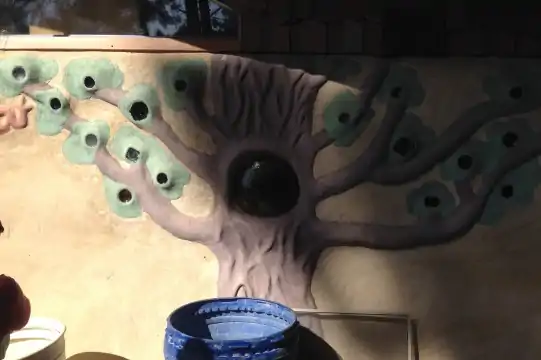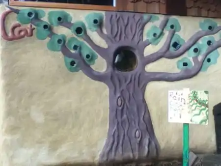 ‘No major updates since the creation of the wall. The cobb was well tested and has been used for a long time before we put it in our wall.’ – Dustin Fredricey, one of the Co directors at CCAT. The cob wall has however been decorated to look like a tree with a colored mix of Earthen Plaster. The cobb was also stated as the reason that the wall is so effective.