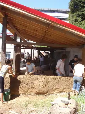 Cob is made from a combination of water, clay, sand/small stones, and straw. Cob is a very ancient building material and has been used throughout history because its durable, cheap, and easy to apply. Cob, if one were to make it out of pure ingredients, would be 70 percent sand, 20 percent clay, and 10 percent water. One aspect of cob that makes it so unique and special is that it can be made anywhere, as long as the components can be shipped, trucked, or flown into the area. Some cool facts about cob is that it is non-toxic and completely recyclable. This can be a nice relief to the health hazards and carcinogens contained in commonly utilized, 20th century building materials like asbestos and lead paint. Also cob is environmentally sound; it makes no contributions to deforestation, pollution, or mining. Likewise, no power tools or manufactured materials are needed to make a cob structure. The word cob is rooted in Old English, derived from a word meaning "a lump or rounded mass" and is completely built by hand. Since cob structures require no frame, the builder is allowed infinite freedom and creativity to proceed within the design of the structure, much like building with clay.