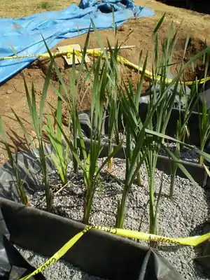 Treatment within the marsh is primarily dedicated to the microbial action within the root structure of the marsh plants. We chose to use bulrush and cattail plants because they work best for subsurface gravel applications; they can also be found locally, and are the most commonly utilized plants for marsh and wetland treatment. We retrieved our individual plants from the local tributary system because they have already established a microbial community within their root structure. At the time of transplant, Arcata was experiencing unseasonably high temperatures. If the shock is too great for the current plants, there are replacements being cultivated in a bathtub on CCAT's grounds.