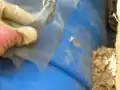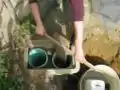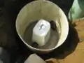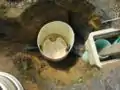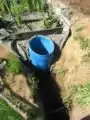 Fig 2a: The hole cut in the first tank was a bit larger than the inlet pipe and was not sealed completely, water can be seen falling out and filling up the surrounding area of the tank
