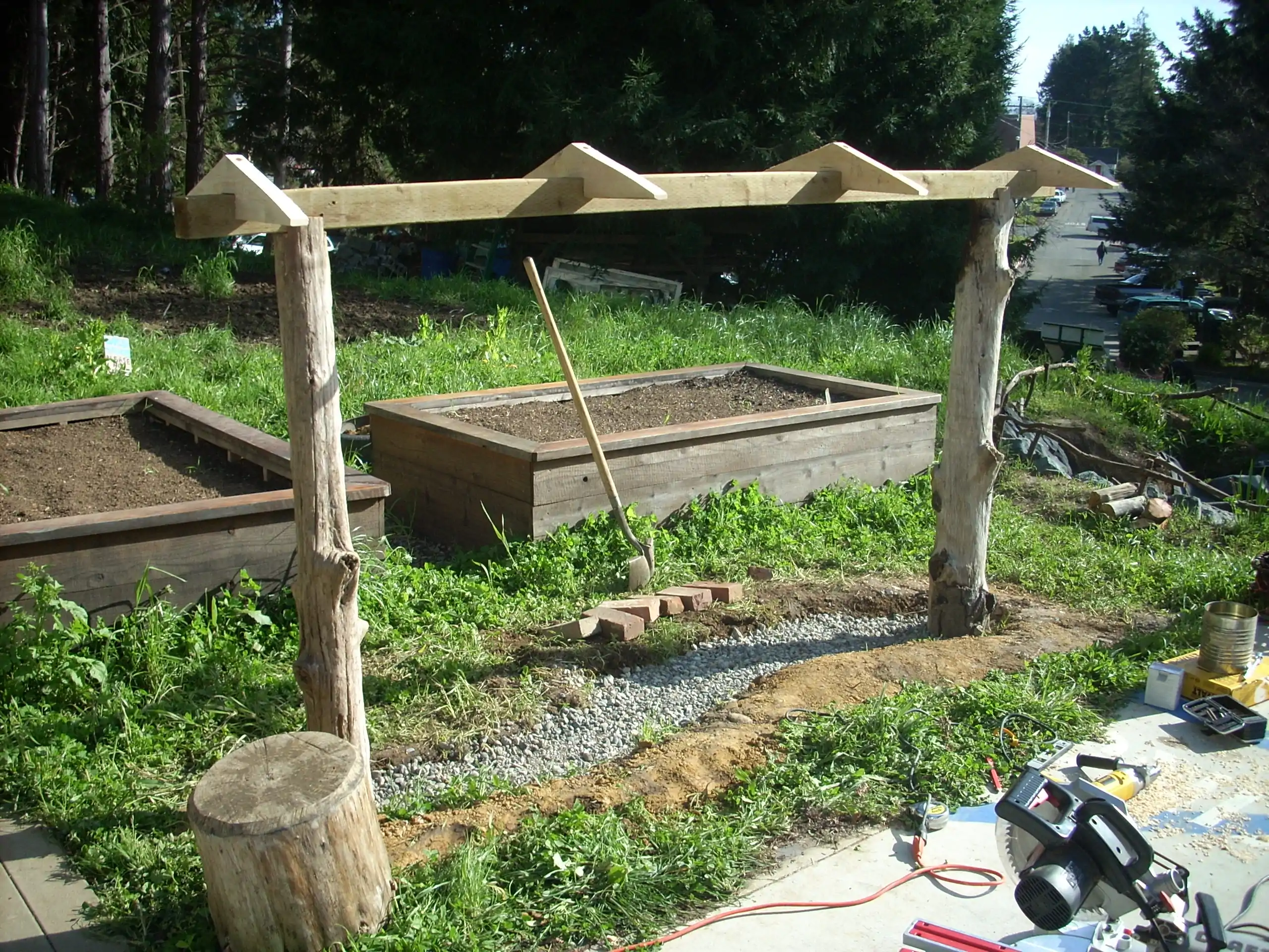 - Timber frame made from reclaimed timber and driftwood logs, simple 4x4s could work fine