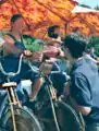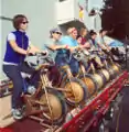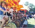 HSU President Roland Richman joins with other volunteers in helping to pedal power the concert stage at HSU Arts and Renewable Energy Fair 2003.