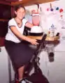 A fan belt is wrapped around the flywheel of an exercise bike and the pulley of high voltage, low rpm permanent magnet dc generator. 110v blenders and some other low power ac appliances can be powered provided they are built using universal motors which run on ac or dc. The next stage of development of this project is to mount the generator directly to the frame of the exercise bike via a gravity tensioned swing arm. This will eliminate the need for the heavy wooden pedistle upon which the generator is currently mounted. The electrical wiring should be brought up to code. Transparent lexan-polycarbonate finger gaurds should be installed to prevent children from catching their figures between the fanbelt, pulley and flywheel. Lastly, large caster wheels should then be mounted to the base of the exercise bike's frame so that the devise can be moved easily. Because of the redundant nature of an exercise bike as compared to a bicycle that is used for transportation, a system should be designed that incorporates a blender, powered by a generator mounted on a bicycle that tows an ice-box trailer.