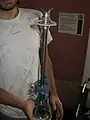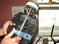 CCAT member Eric holds up a part that needs to be fixed/replaced for the pedal electric blender. It needs new bearings and CCAT is wants to design a new design for the drive shaft/train. They use a skateboard wheel for friction interface.