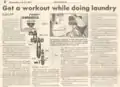 This article appeared in the HSU Lumberjack newspaper in 1997. The article is based on an interview with the pedal powered washing machine designer, Bart Orlando. Since then, the pedal power drive line of the washer has been simplified. The number of fanbelts used has been reduced from two belts to one belt. Now, one fanbelt connects the flywheel of the exercise bike directly to the pulley which drives the transmission of the washer. This reduces the amount of friction by eliminating one belt and two pillow blocks. Less friction translates into less pedaling effort.