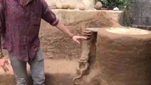 Straw Slip Insulation against bottom foundation- rice straw added to a mixture 4:1 of clay and water.