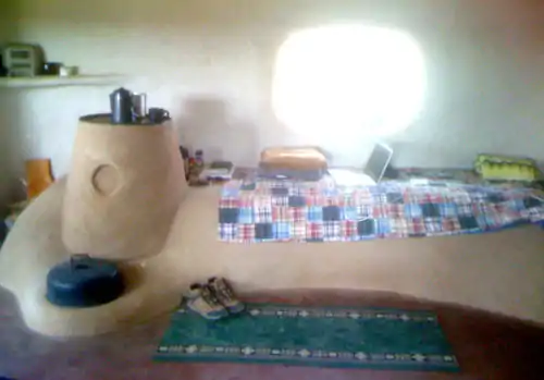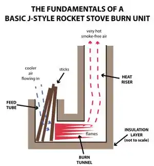 A rocket mass heater, or rocket stove, consists of a right angle ‘J’ shaped combustion chamber inside of an insulated container. This insulation container creates a draft in which the heat gasses are drafted and then pushed through piping into the mass. This concept can be applied to heat earthen built furniture in homes that contain high thermal mass. [1]