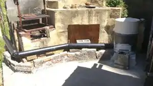 Ducting assembled for a slight rise from the combustion chamber to exhaust chimney. Brick and mortar for the framework of cobb footprint.
